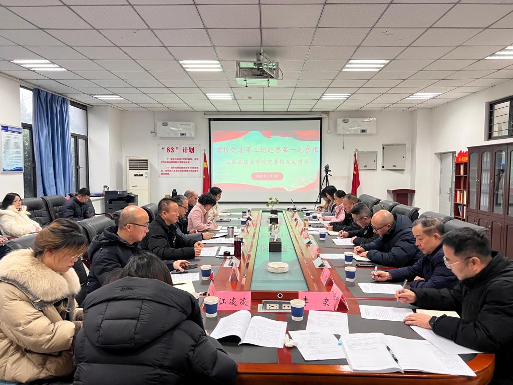 根据学校党委巡察工作统一部署,1月5日,学校党委第三轮巡察第一巡察组巡察基础医学院党委情况反馈会在基础医学院会议室召开。驻校纪检监察组组长、校党委副书记、纪委书记、党委巡察工作领导小组常务副组长王军,校党委常委、副校长代敏,纪委办公室、党委组织部、党委巡察办负责人,党委巡察组组长、副组长、联络员,基础医学院党委班子成员参加会议。党委巡察办人员、基础医学院纪委班子成员、党支部书记、教职工及退休教师代表列席会议。会议由基础医学院党委书记朱德超主持。